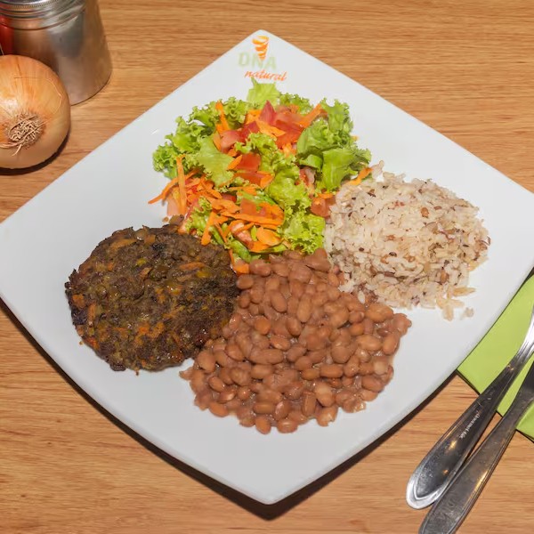 100g de hamburguer artesanal de soja com especiarias e cenoura ralada + 03 acompanhamentos a sua escolha.