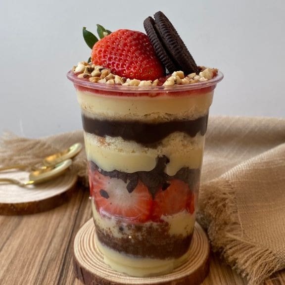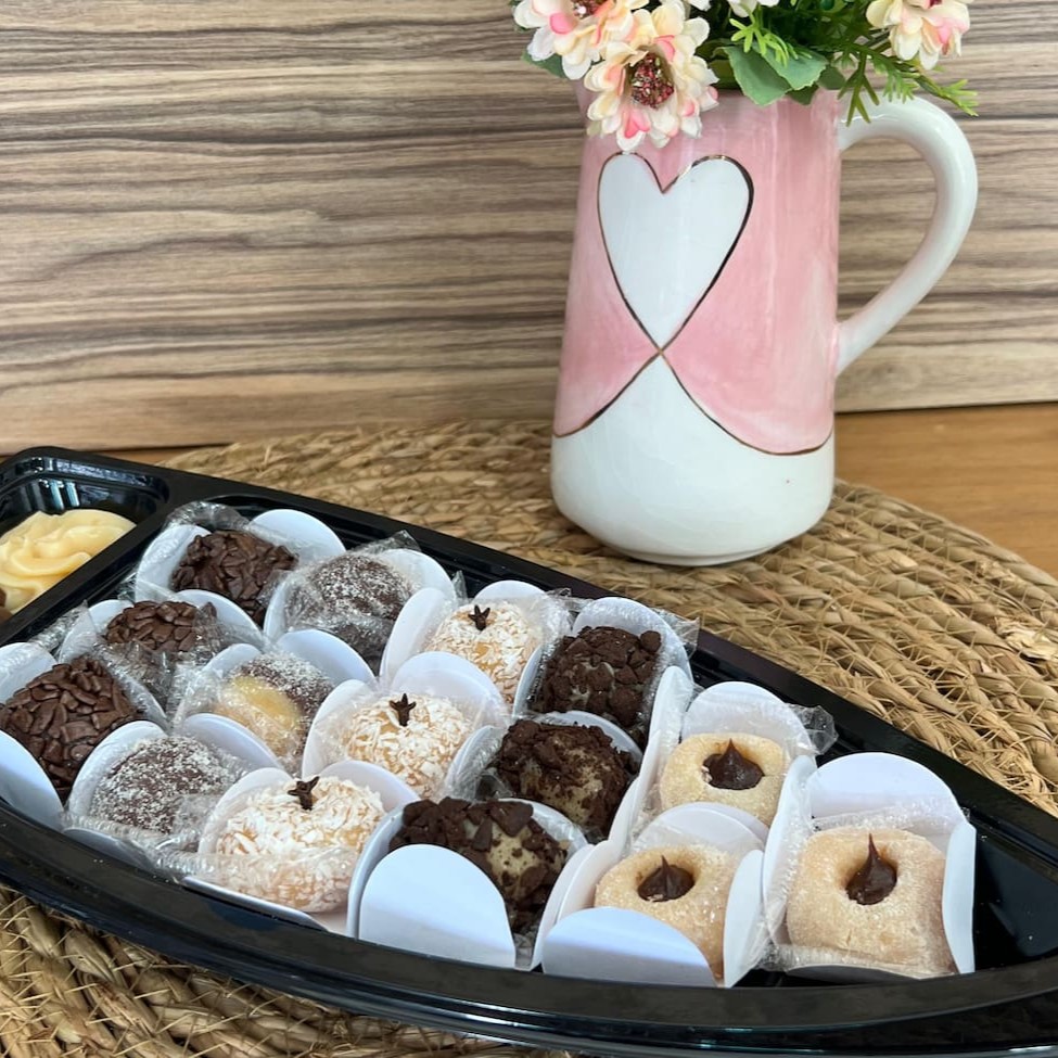 Barca com 15 unidades de doces e 30g de brigadeiro de chocolate e 30g de brigadeiro branco: 3 brigadeiros; 3 casadinhos; 3 ninhos com Nutella; 3 oreos; 3 beijinhos.