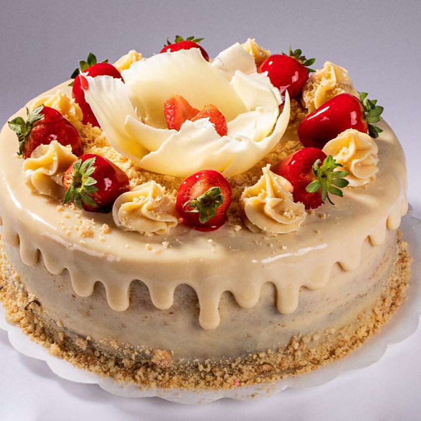 Bolo branco recheado com creme de chocolate branco e morangos. produto congelado (é preciso aguardar o descongelamento de 3h em temperatura ambiente para consumo).