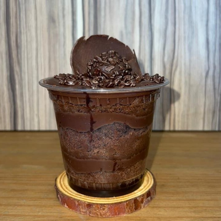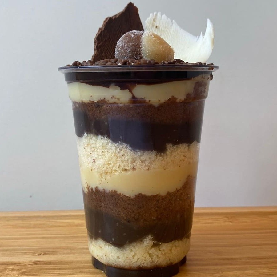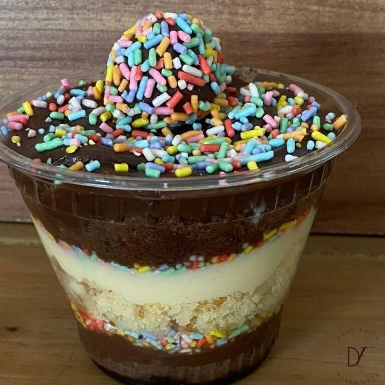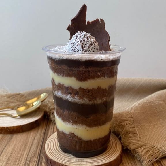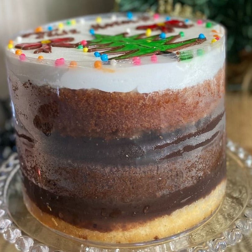 Bolo de chocolate e tradicional, recheado com brigadeiro branco e chocolate, decorado com granulado colorido. 250ml.