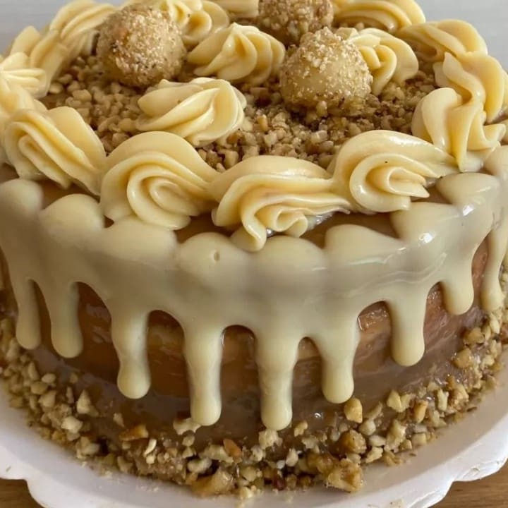Bolo branco recheado com doce de leite e nozes. Produto congelado (é preciso aguardar o descongelamento de 3h em temperatura ambiente para consumir).