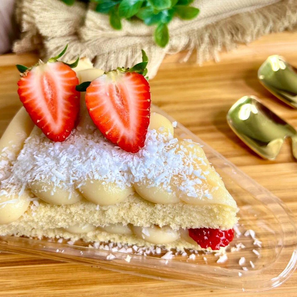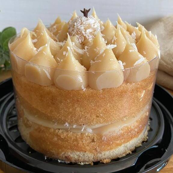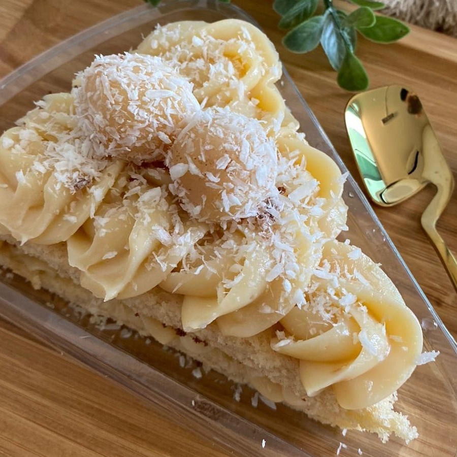 Bolo branco, recheado com creme de coco. produto congelado (é preciso aguardar descongelamento de 3hrs em temperatura ambiente para consumo)