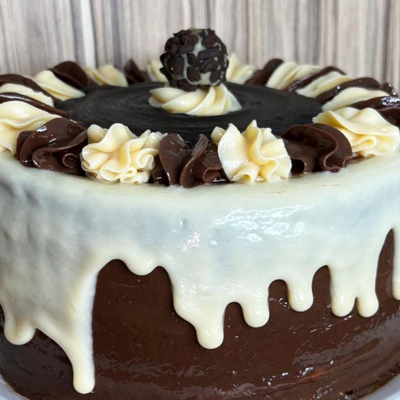 Bolo branco e preto com recheio de brigadeiro tradicional e brigadeiro branco.