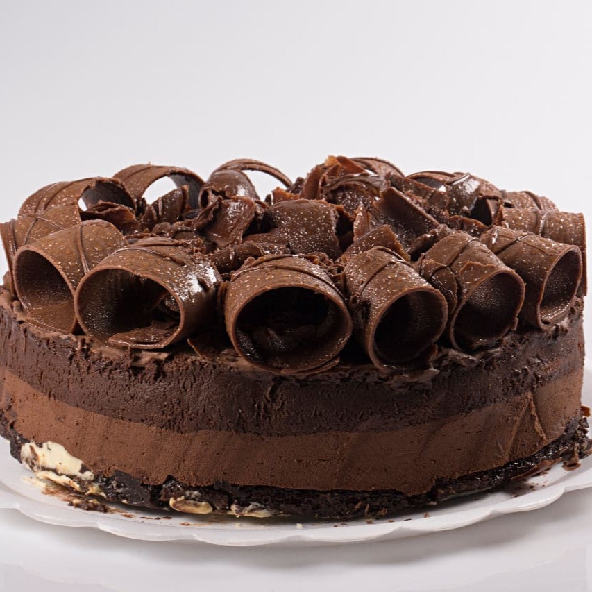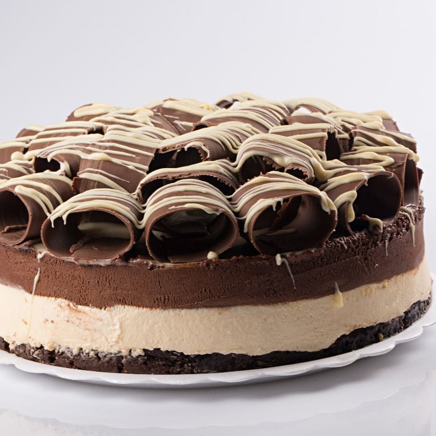 Base búlgara com pavê e mousse de chocolate, decorada com raspas de chocolate.