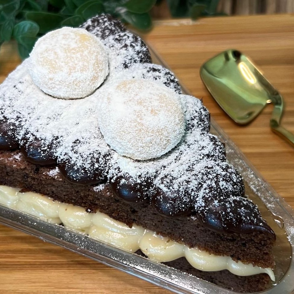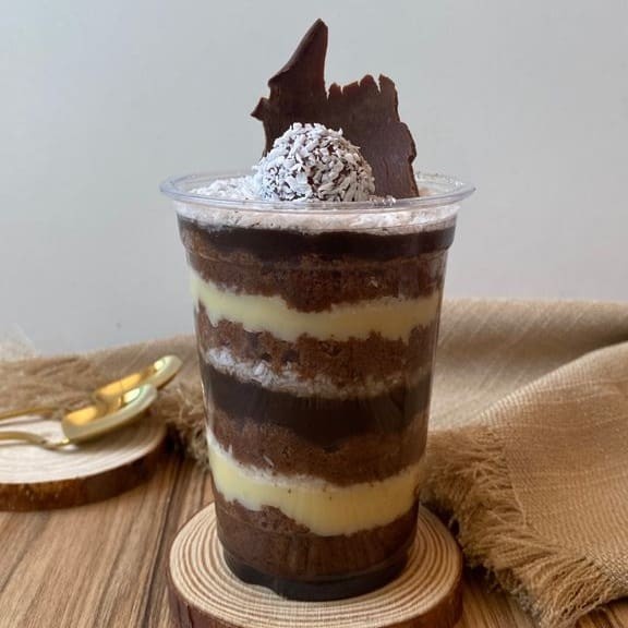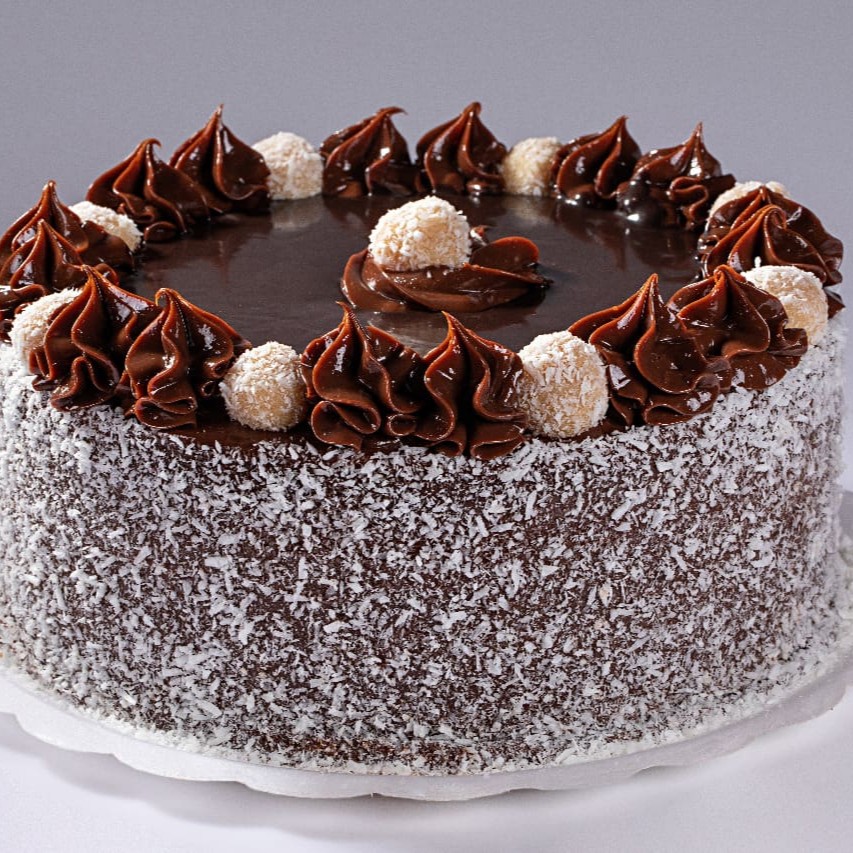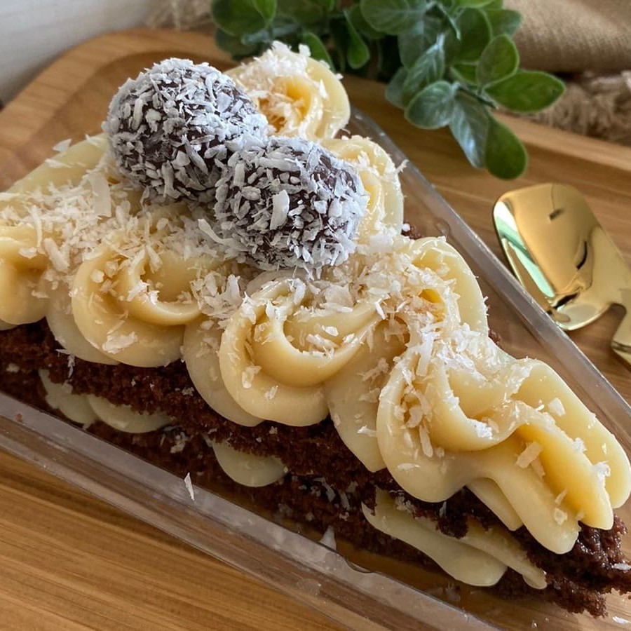 Bolo de chocolate com recheio de creme de coco. Produto congelado (é preciso aguardar o descongelamento de 3h em temperatura ambiente para consumir).
