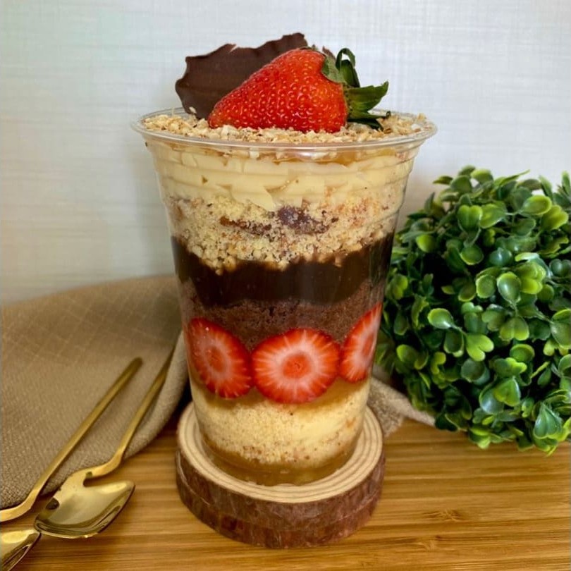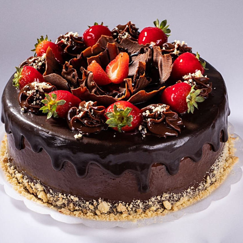 Bolo de chocolate recheado com brigadeiro, creme de chocolate branco e morango. Produto congelado (é preciso aguardar o descongelamento de 3h em temperatura ambiente para consumir).