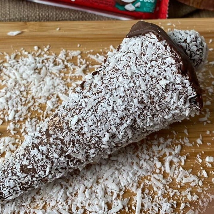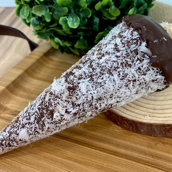 Cone banhado no chocolate recheado com creme de coco.