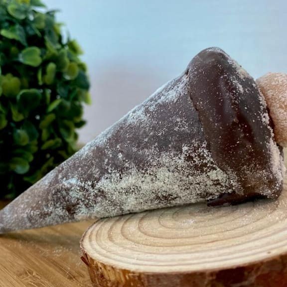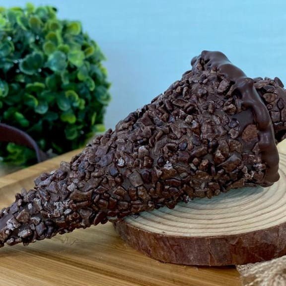Cone banhado no chocolate recheado com creme de beijinho.