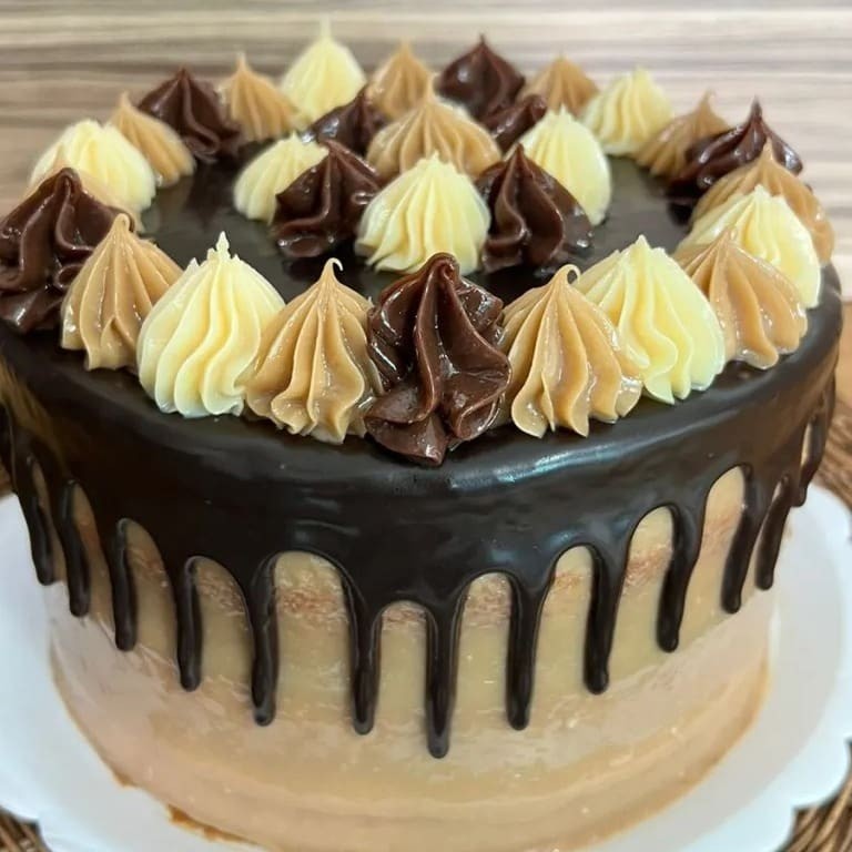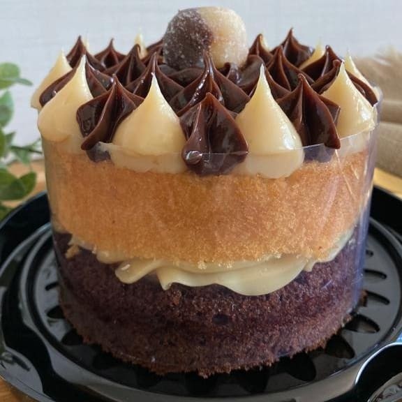 Bolo branco, recheado com brigadeiro tradicional e brigadeiro de caramelo. Decorado com calda de brilho e bicos de doce de leite e brigadeiro branco. Produto congelado (é preciso aguardar o descongelamento de 3h em temperatura ambiente para consumo). Grande: (Diâmetro - 20 cm / Rende até 20 fatias).