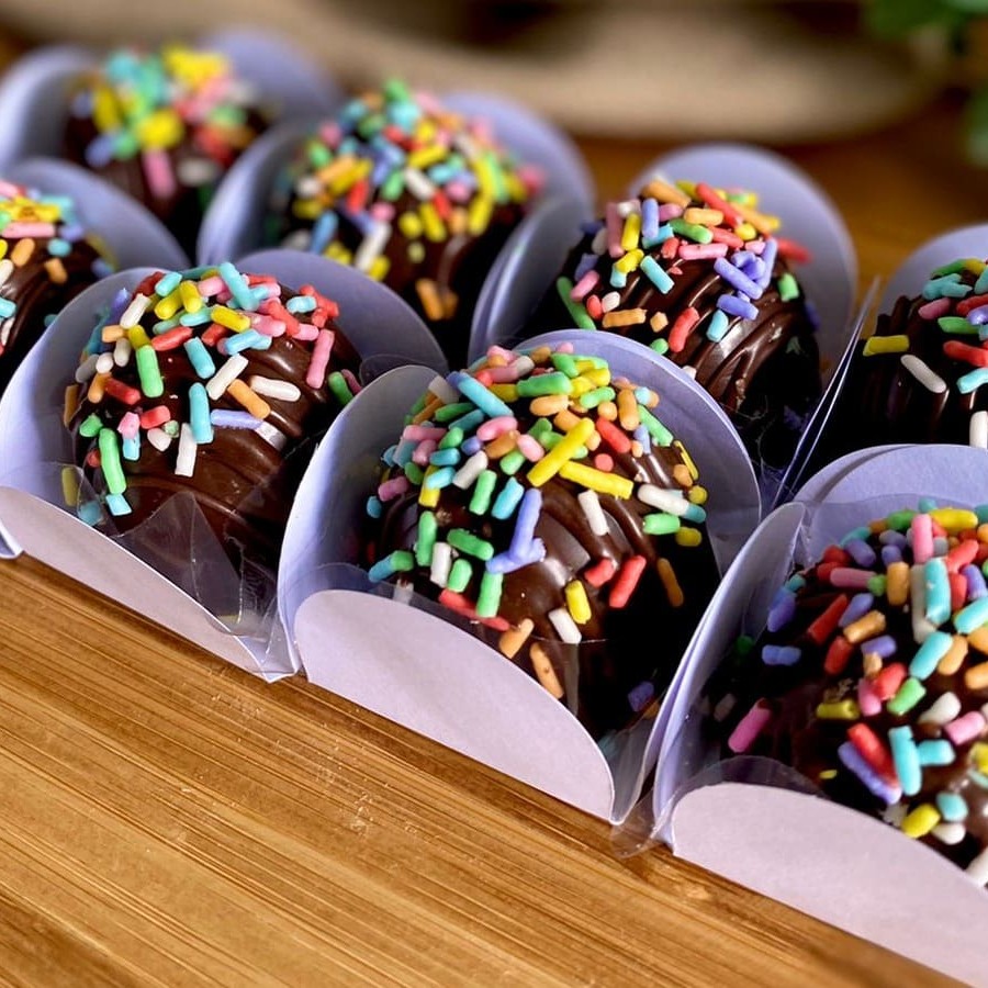 8 trufas de chocolate, recheadas de brigadeiro e decoradas com granulado colorido.