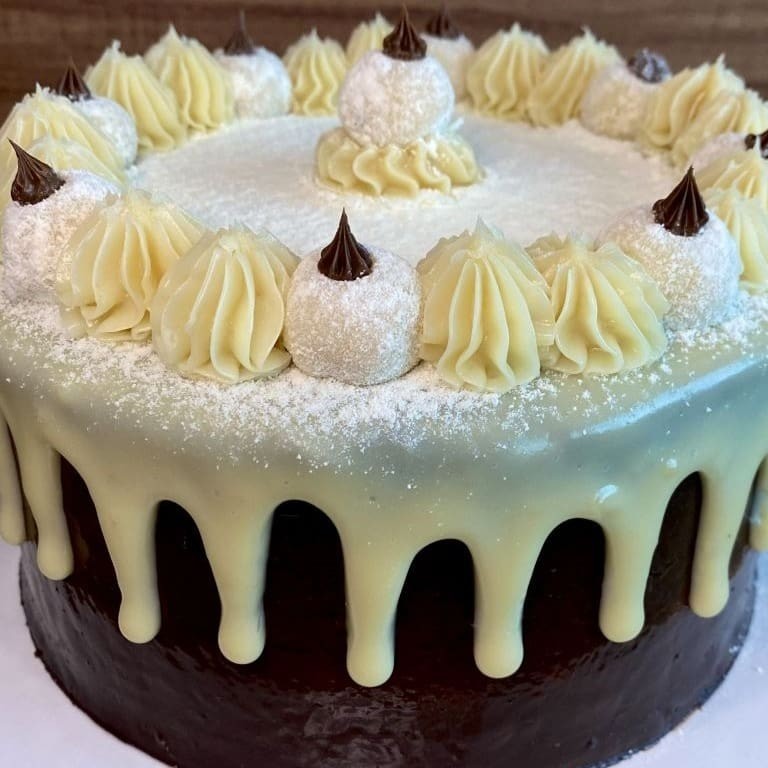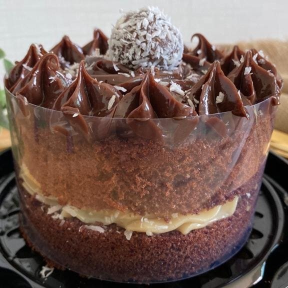 Bolo preto, com recheio brigadeiro branco com coco e bombom Prestígio. 10 cm de diâmetro