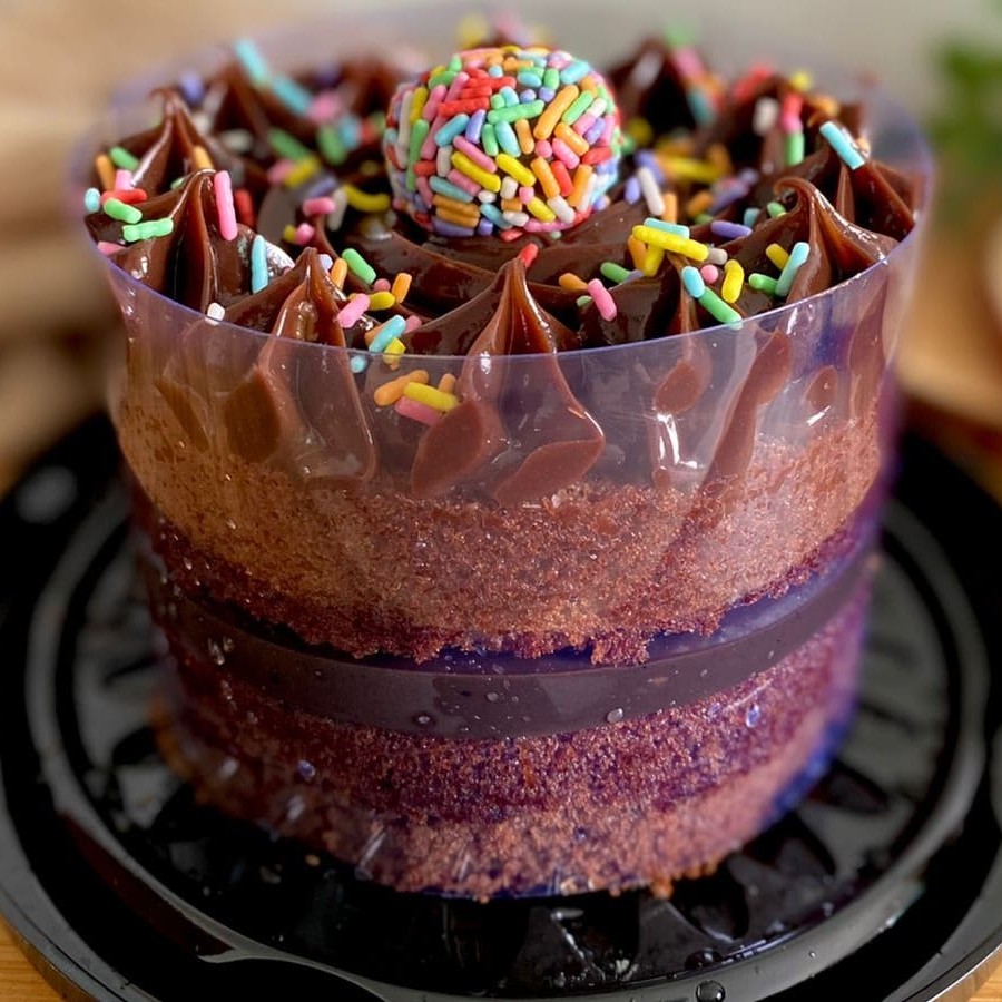 Bolo de chocolate com 10 cm de diâmetro, com recheio de brigadeiro preto e granulado colorido.