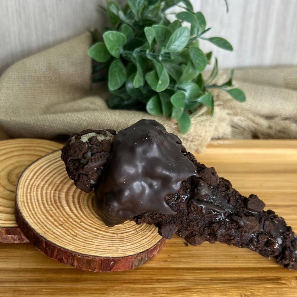 Cone banhado no chocolate recheado com creme de Oreo.