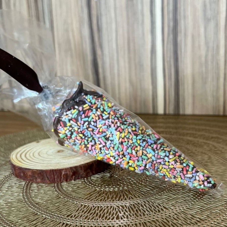 Casquinha banhada no chocolate, recheada com brigadeiro tradicional e granulado colorido.