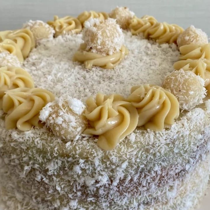 Bolo branco com recheio de brigadeiro de coco e bombom beijinho. 10 cm de diâmetro