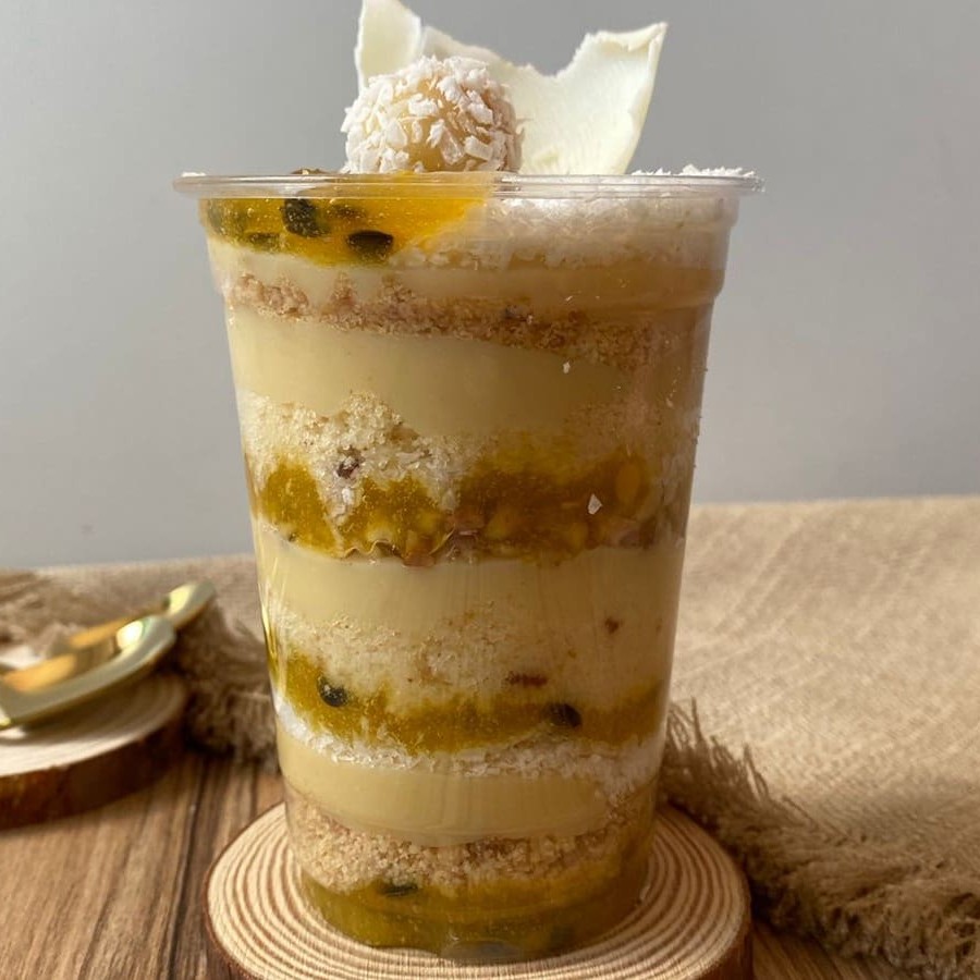 Base búlgara com creme de maracujá e chocolate, decorada com raspas de chocolate ao leite.