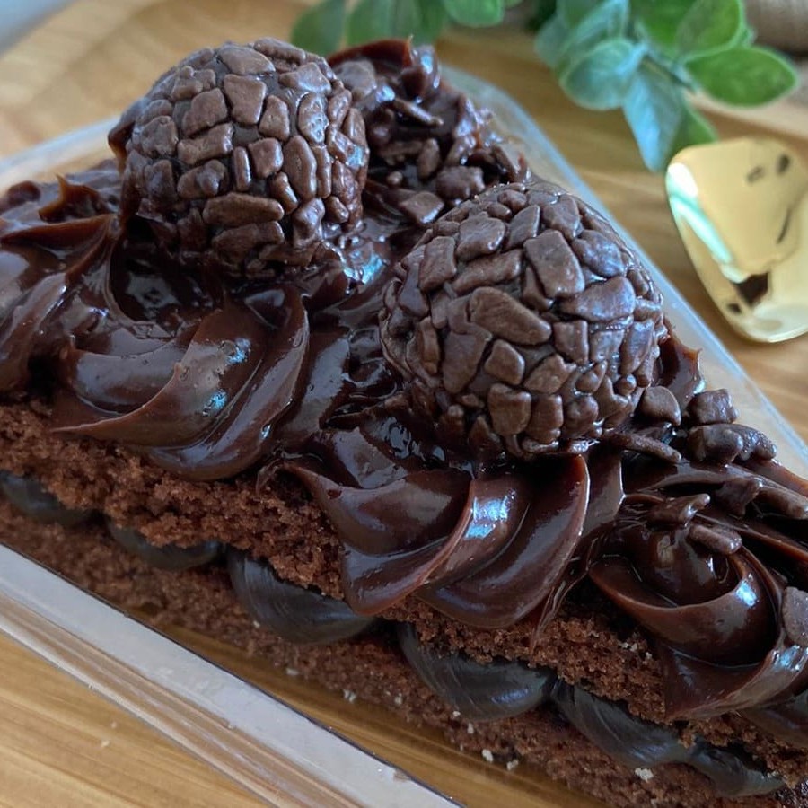 Fatia de chocolate com recheio de brigadeiro e bombons.