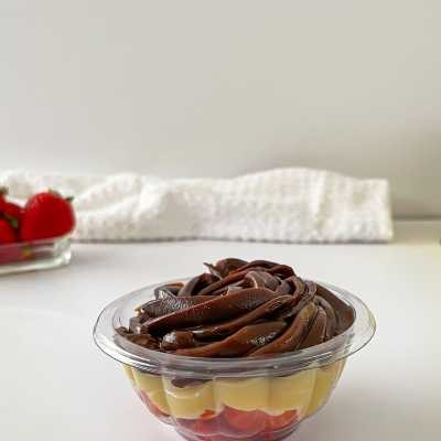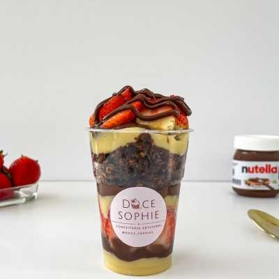 Delicioso creme de chocolate 50% cacau, brownie chocolatudo, morangos frescos, brigadeiro de ninho e nutella.
