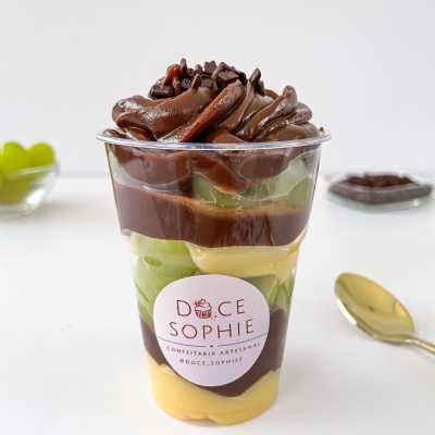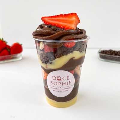 Delicioso copo feito com creme de Ninho, brownie especial bem chocolatudo, brigadeiro 50% cacau e morangos fresquinhos selecionados.