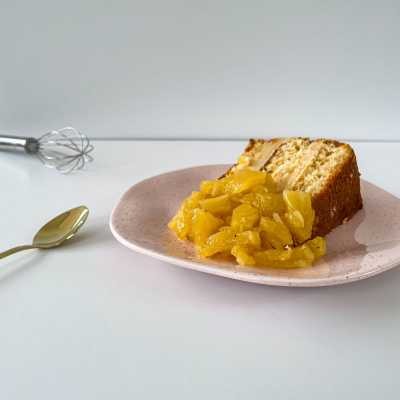 Massa amanteigada de baunilha, brigadeiro cremoso de ninho com pedaços de abacaxi caramelizado