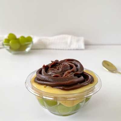 Recheio de chocolate 50% cacau, uvas frescas e nosso delicioso creme de ninho.