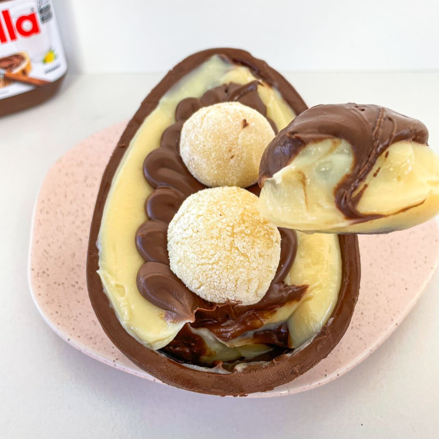 Casca blend chocolate nobre, recheio super cremoso de ninho e nutela pura.