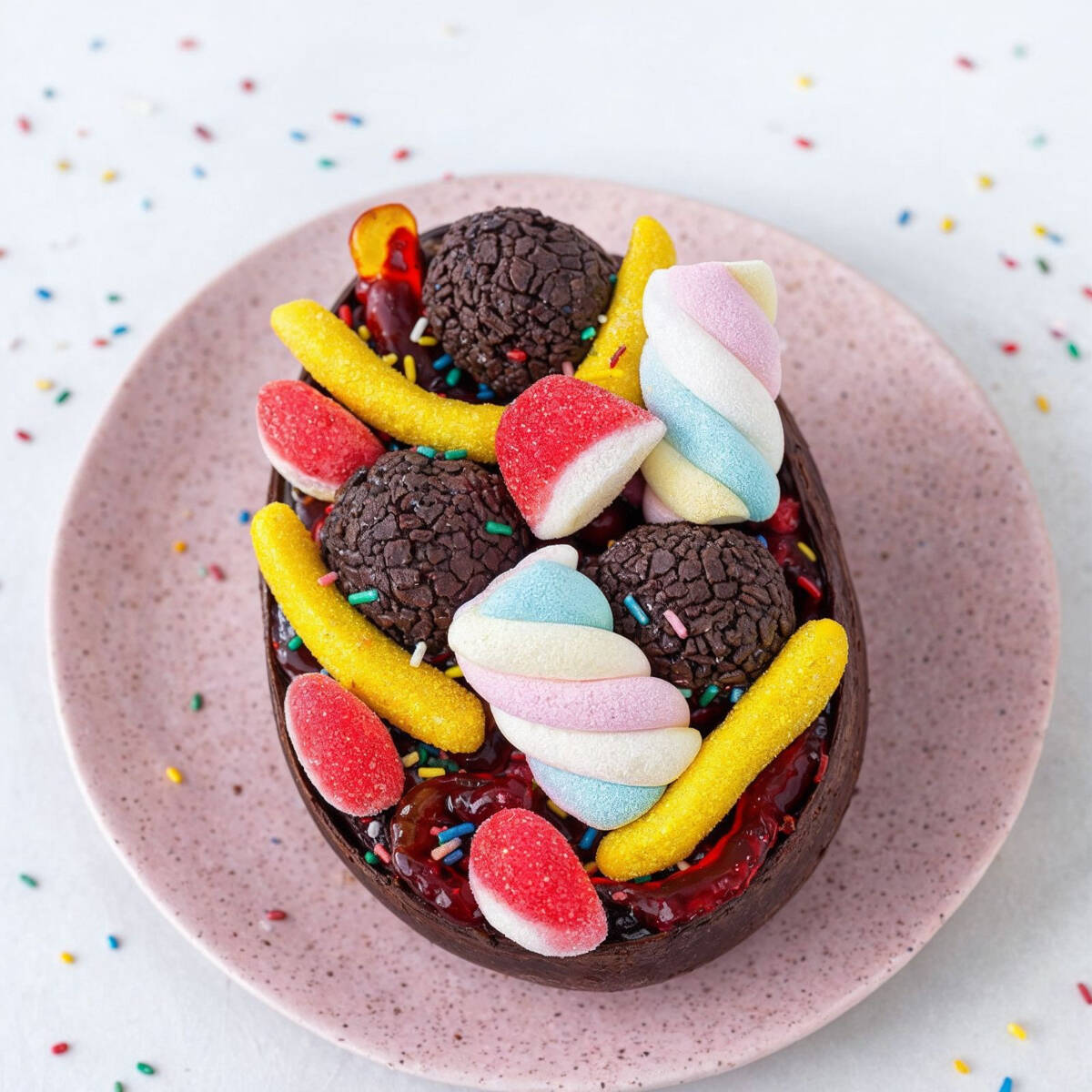 Casca blend chocolate nobre, recheio de choconinho cremoso e varios finis no topo