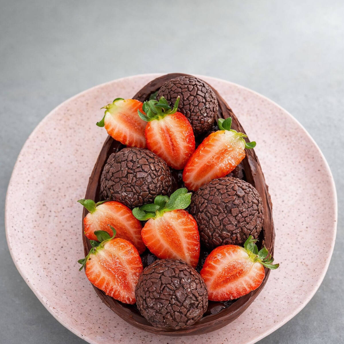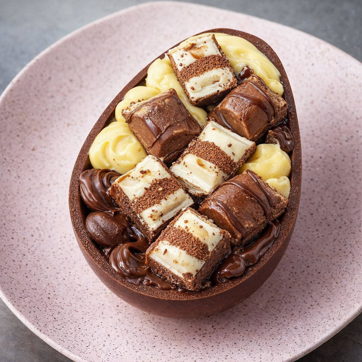 Casca brownie, brigadeiro cremoso e recheio de ovo maltine crocante, finalizado com ovo maltine rocks