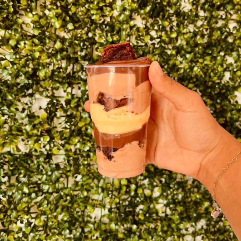 Copo da Felicidade de 300 ml com camadas de mousse de chocolate com chocolate blend super levinho, camadas de brigadeiro de Ninho e chocolate 50% e brownie