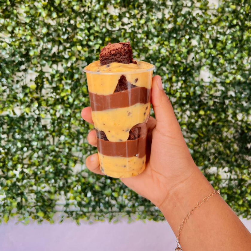 Copo da felicidade de 300 ml, com camadas super cremosas de brigadeiro 50 % e brigadeiro de maracujá e camadas de brownie