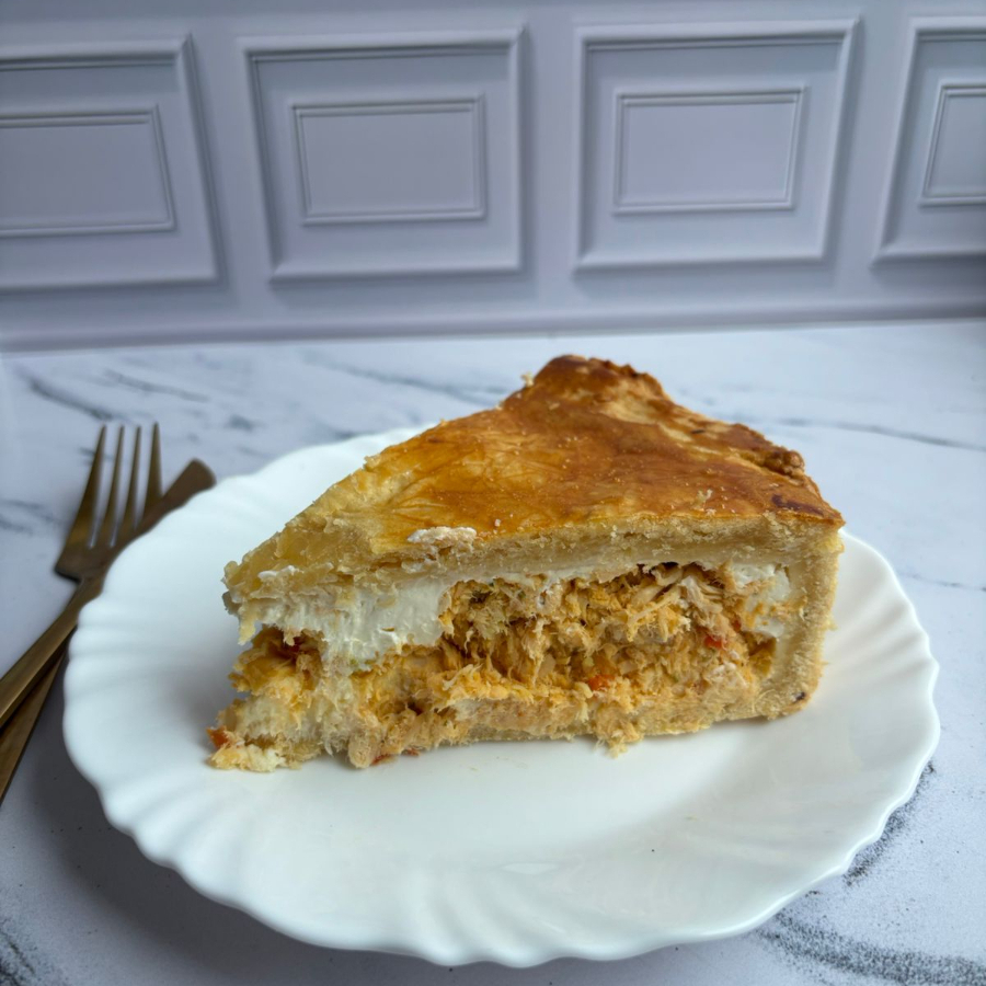 Torta cremosa de frango desfiado com catupiry em massa folhada crocante.