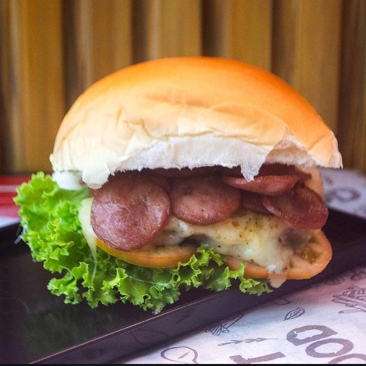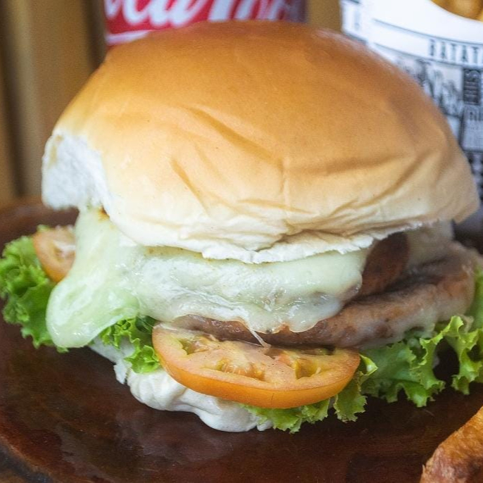 Pão, 2 carnes, 2 fatias de queijo, alface, tomate e maionese da casa.