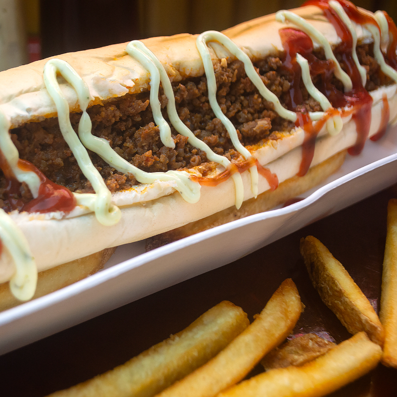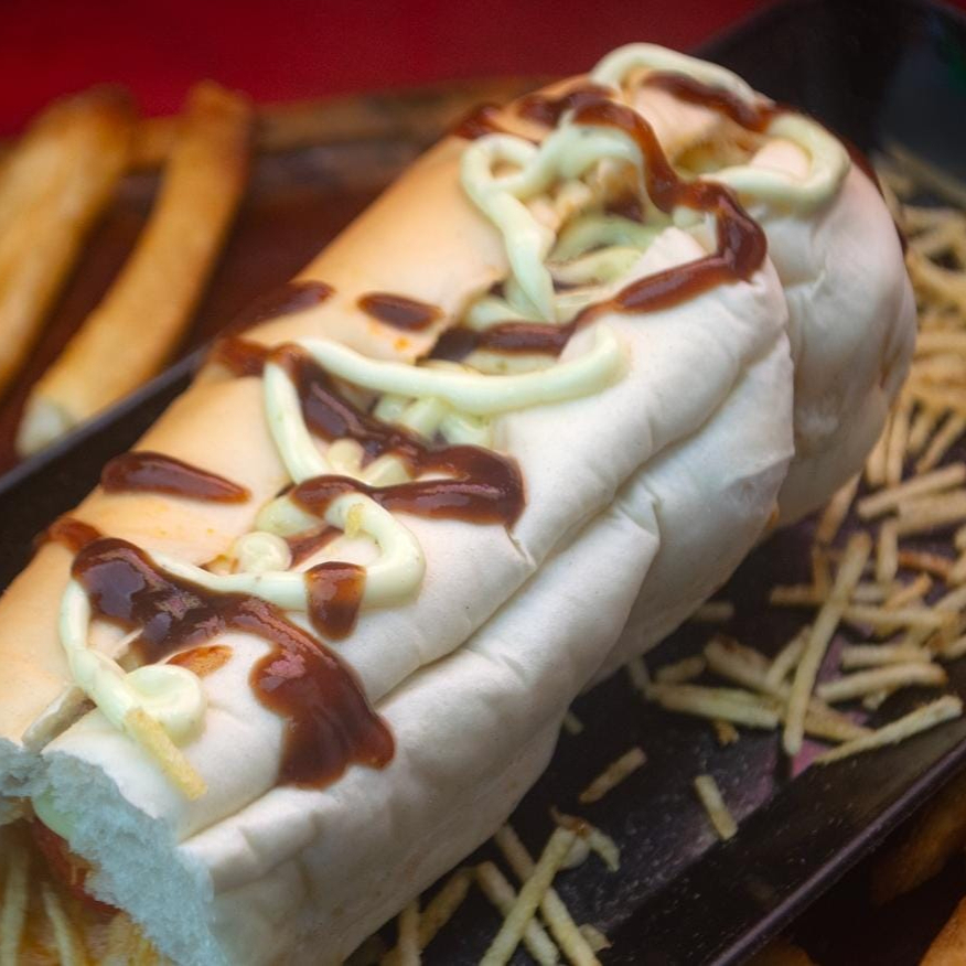 Pão 30 cm, carne moída, 2 salsichas, batata palha e maionese.