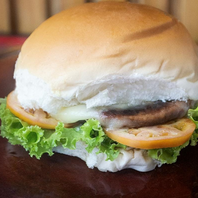Pão, carne, queijo, alface, tomate, maionese da casa