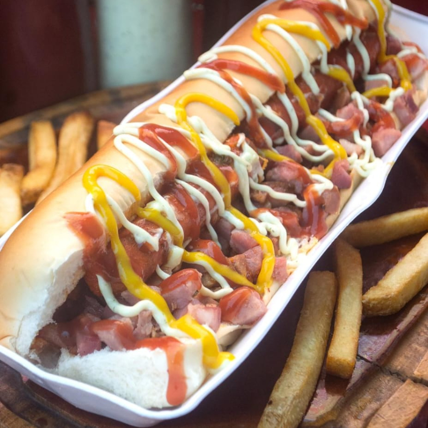 Pão de 30 cm,2 salsichas, calabresa e bacon cortados em cubo, molho de tomate caseiro, maionese temperada, ketchup, queijo ralado, batata palha