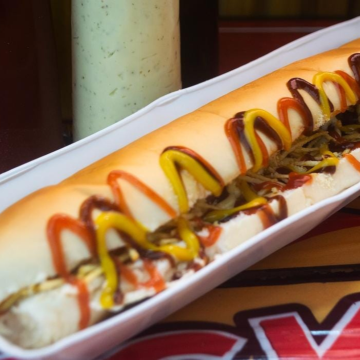 Pão de 30 cm, 2 salsichas, molho de tomate caseiro, maionese temperada, ketchup, queijo ralado, batata palha