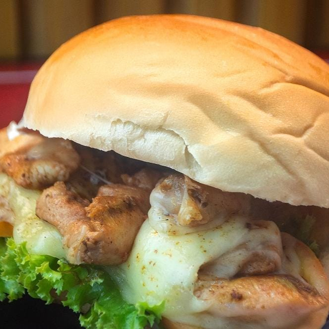 Pão, filé de frango em cubo, queijo, alface, tomate e maionese da casa
