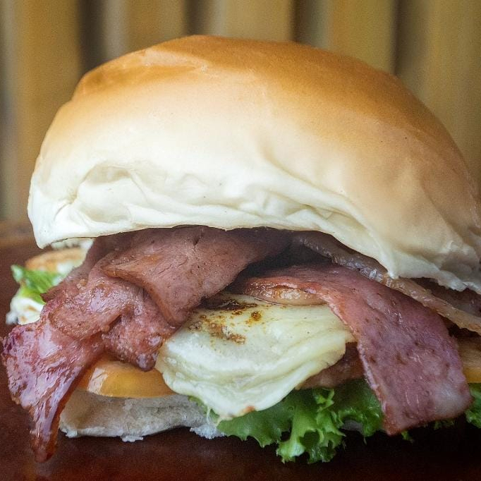 Pão, carne, bacon em tiras, queijo, alface, tomate e maionese da casa.
