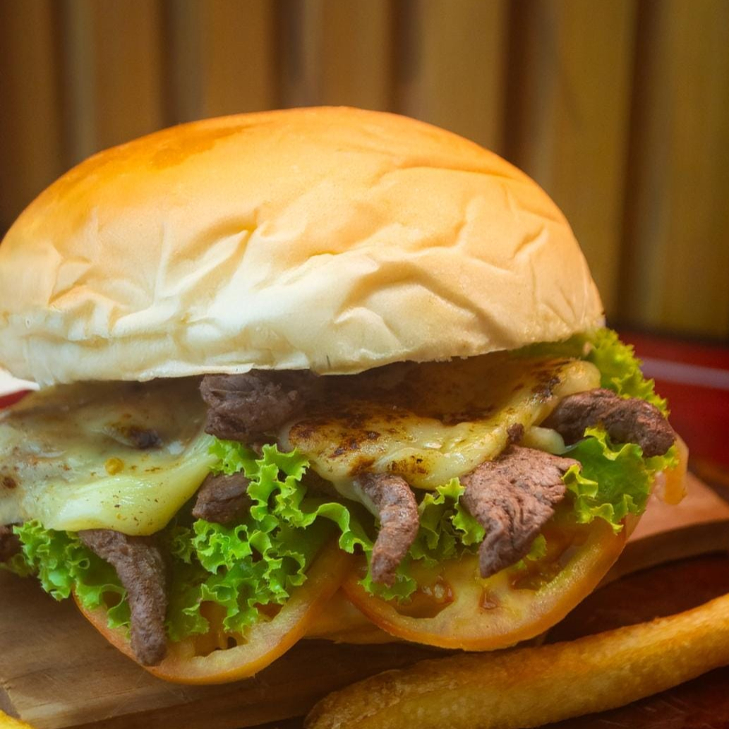 Pão, filé mignon cortado em tiras, queijo, alface, tomate e maionese da casa