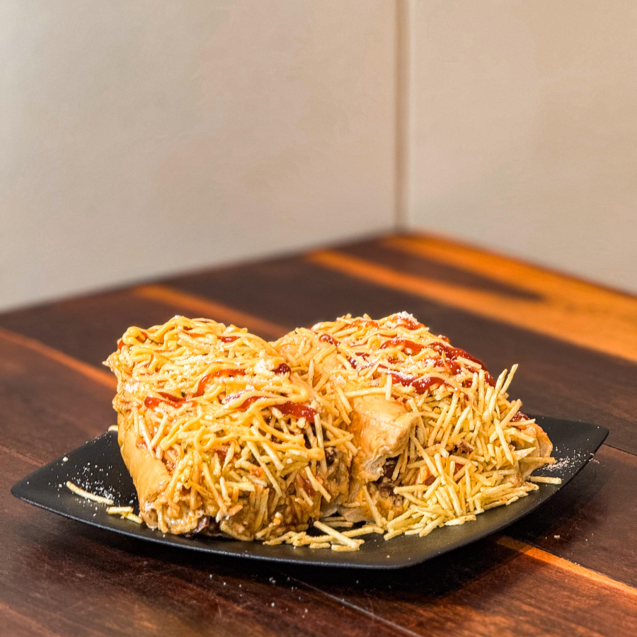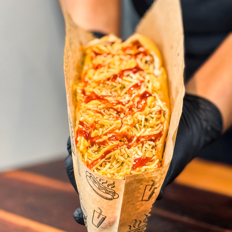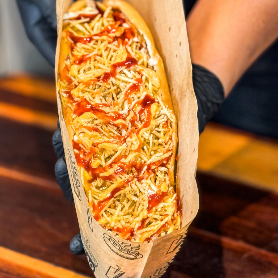 DOGÃO NA CHAPA DUAS Salsichas, Ketchup, Maionese, Molho Especial, Barbecue, Mostarda, Cheddar, Batata Palha, Queijo Ralado.