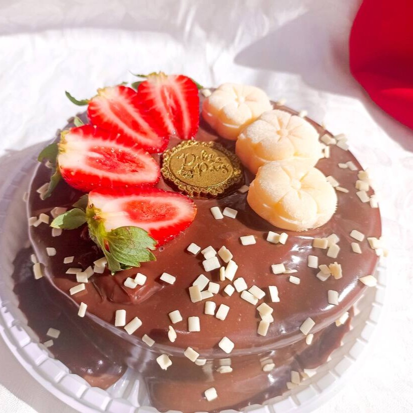 Bolo caseirinho com cobertura de chocolate cacau 50% e decorado com morangos, brigadeiros e granule , serve de 8 a 12 pessoas.