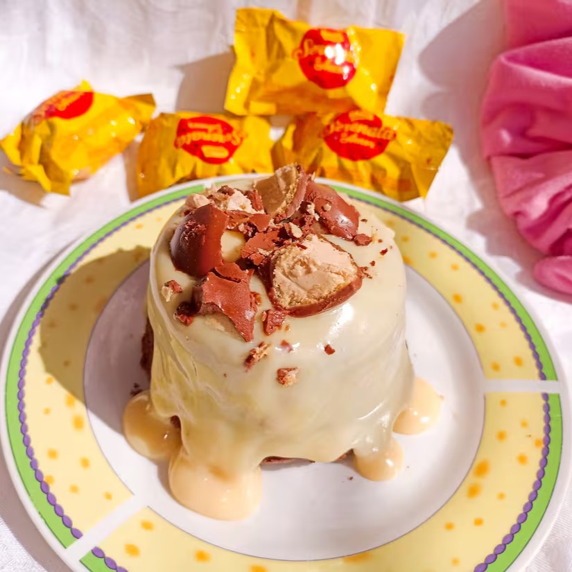 Bolo vulção como massa fofinha de chocolate, coberta de recheio cremoso de Ninho com pedaços do Bombom Serenata de Amor.