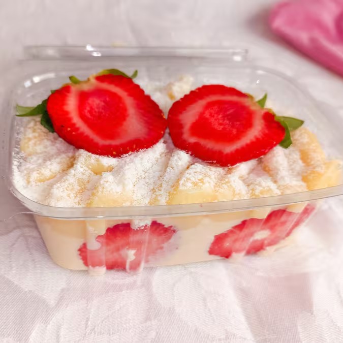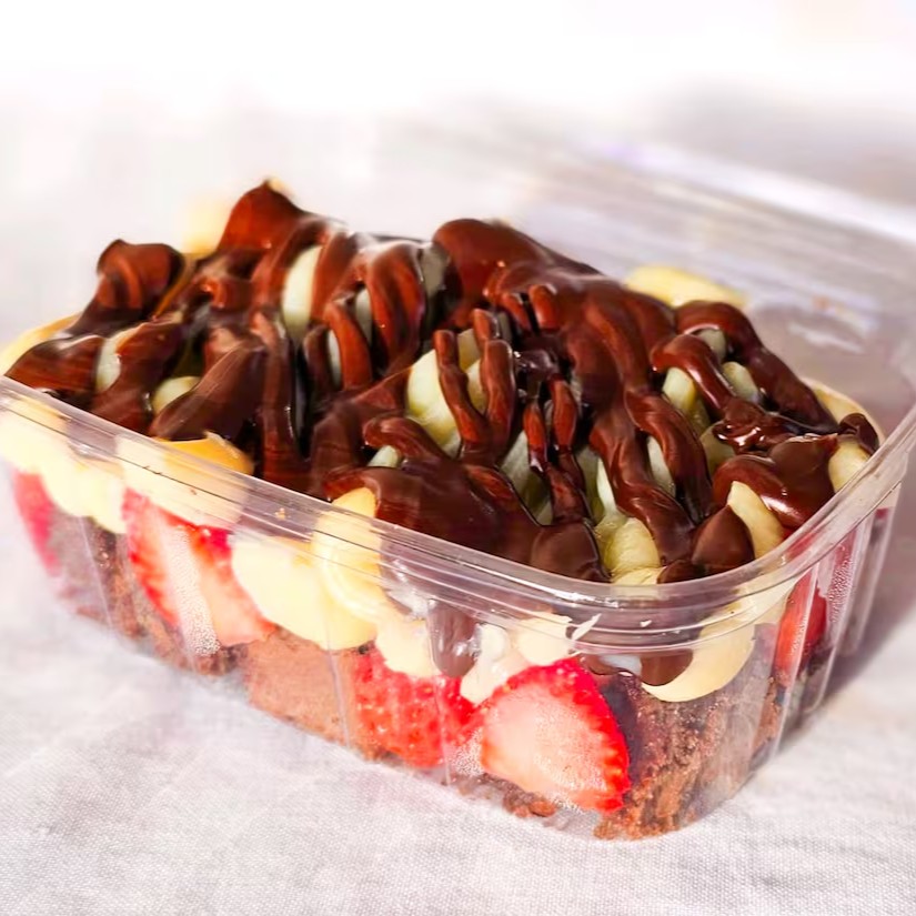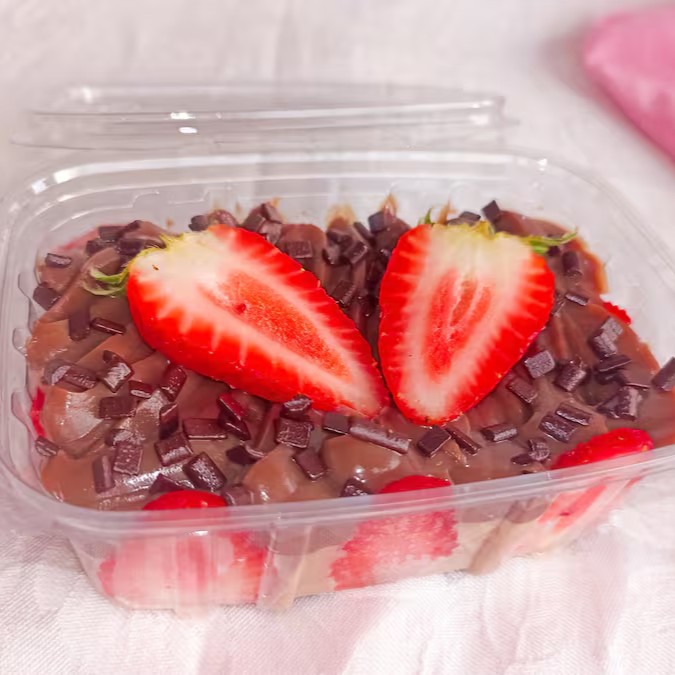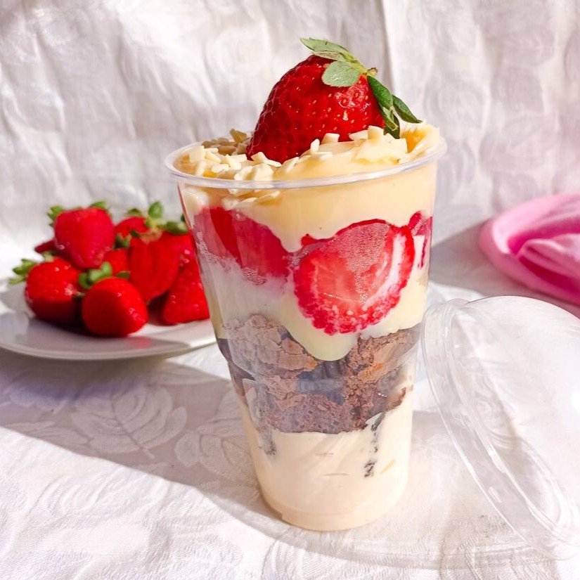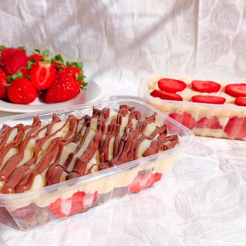 Essa maravilha é composta de morangos selecionados, mousse de Ninho, biscoito Maisena e brigadeiro de Ninho e para finalizar um morango na decoração.