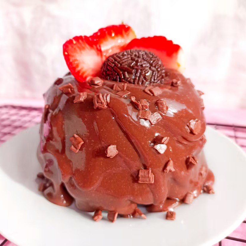 Bolo vulção como massa fofinha de chocolate, coberto com recheio cremoso de chocolate com pedaços de morango. Peso aproximado 200g