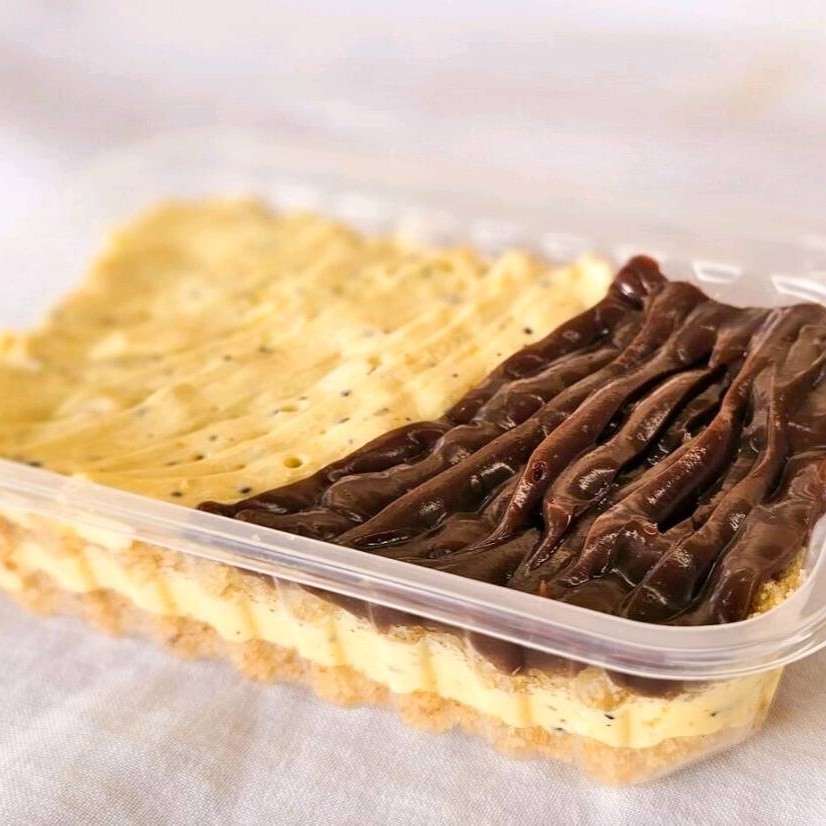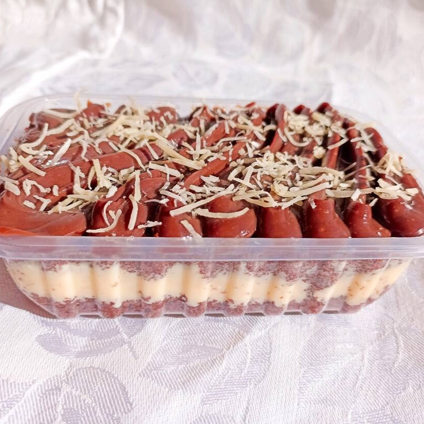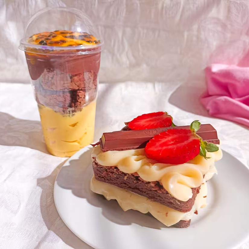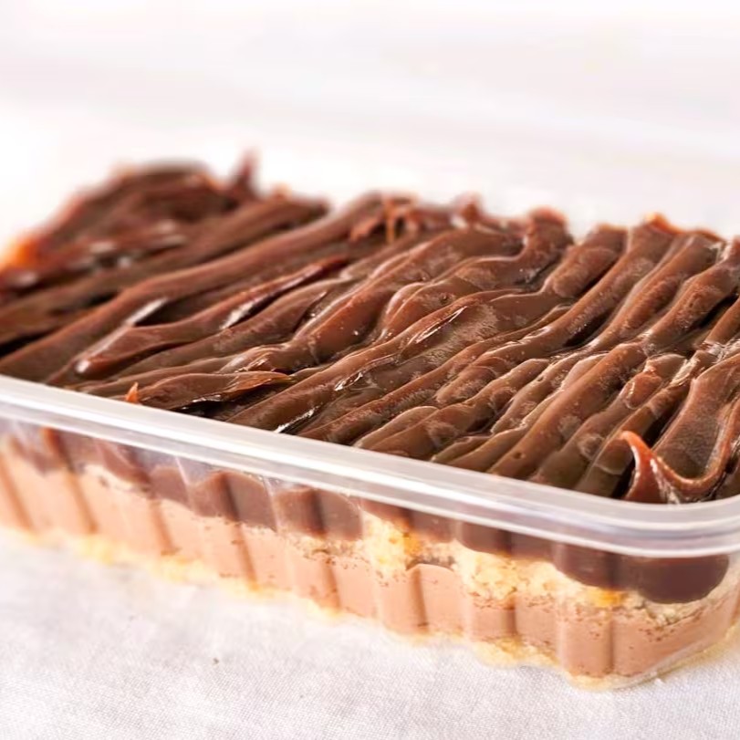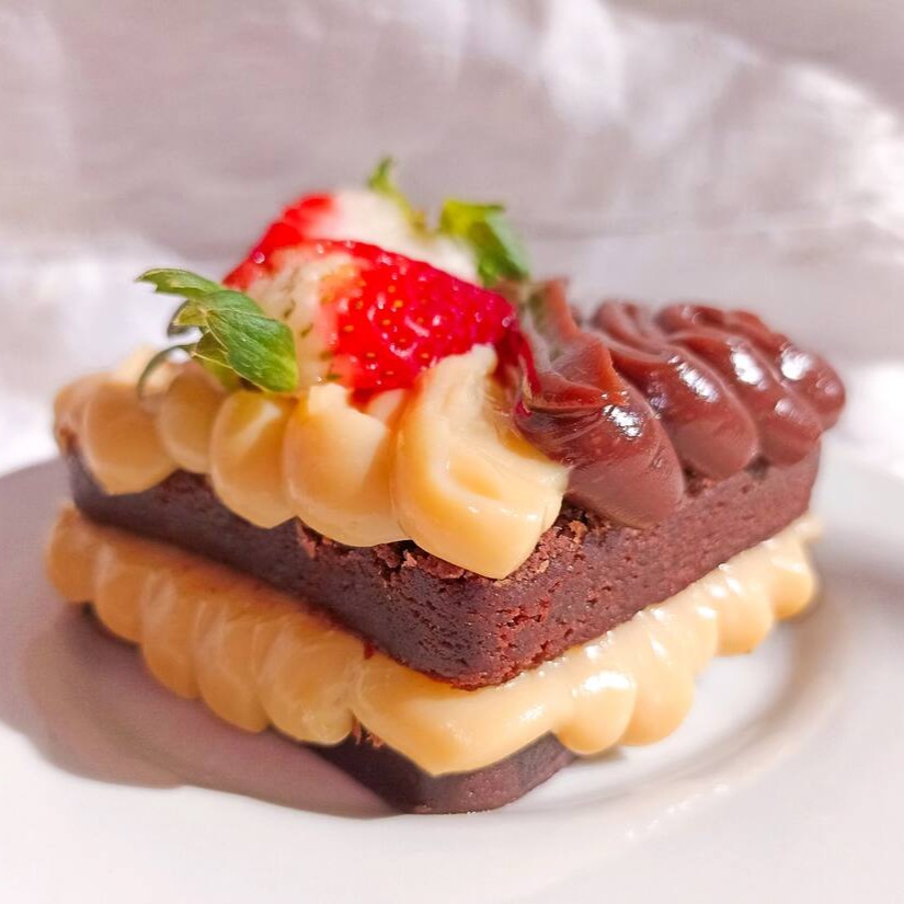 Duas fatias de brownie 7x7cm com recheio de brigadeiro e um complemento à sua escolha.