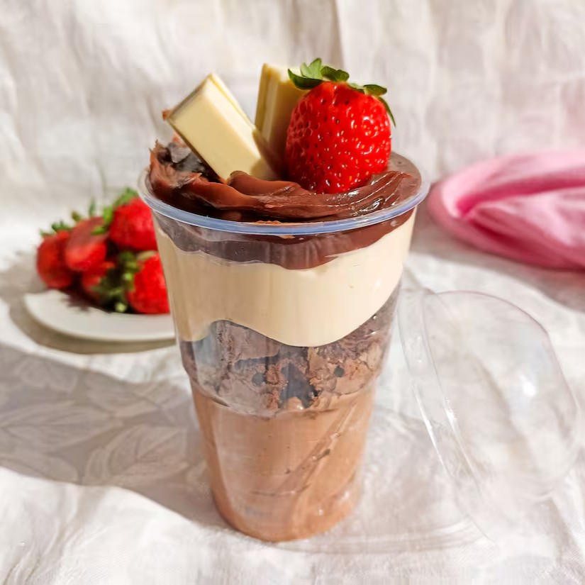 Copo da felicidade - Duplo Ninho com de mousse de Ninho, morango fatiado, pedaços de brownie e brigadeiro de Ninho, decorado com Granule branco e morango.