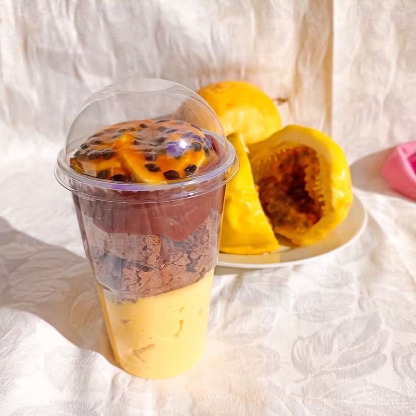 Combo Delícias - Copo da Felicidade Gelado de maracujá, mouse de maracujá com pedaços de brownie e brigadeiro