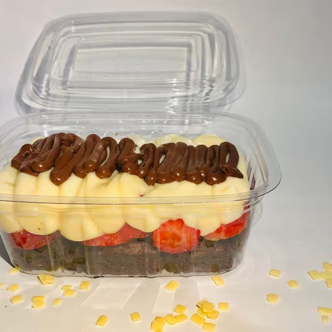 Escondidinho de Brownie: Brownie úmido e intenso, coberto com morango fresco e doce, e finalizado com uma camada de brigadeiro cremoso. Um trio perfeito de sabores!