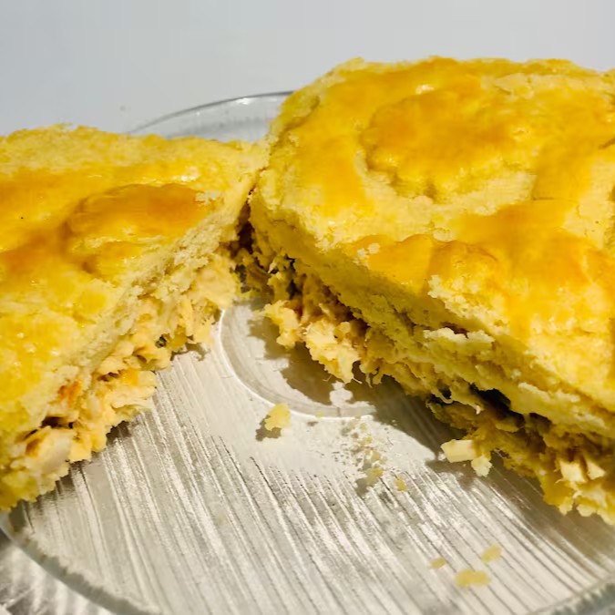 Empadão de frango com Catupiry: massa crocante e dourada, recheada com frango desfiado bem temperado e cremosidade irresistível do Catupiry, resultando em um prato saboroso e aconchegante ( Serve 1 Pessoa ) Peso: 220g