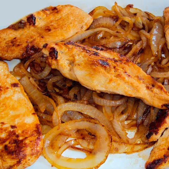 Filé De Frango Acebolado, Arroz , Macarrão, Feijão De Caldo